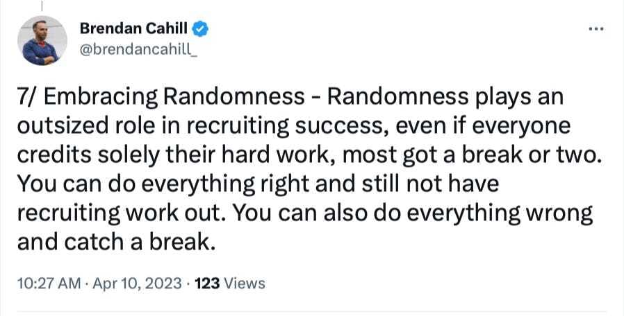 As you go into your recruiting, work or life this week work hard, yes, but also understand that randomness, timing and luck are forever on the prowl unexpectedly influencing your life (for better or for worse)